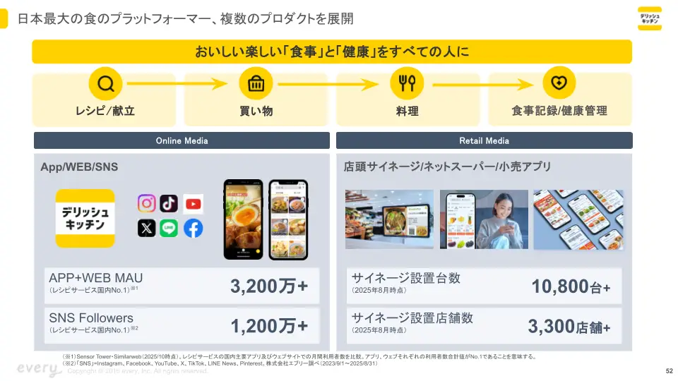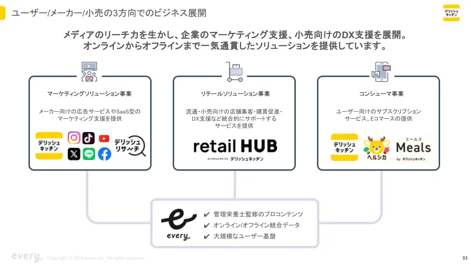 ユーザー(toC)向けには、「レシピ動画アプリ」から「AI料理アシスタント」への進化 (参考: https://everything.every.tv/20241111)。10年間で蓄積した”食のデータ”と”信頼性あるレシピコンテンツ”を活用しながら、ユーザー一人ひとりにあたな専用の管理栄養士が寄り添う新たな食体験をつくり出そうとしています。「冷蔵庫に豚肉とキャベツしかない」「最近、脂質を摂りすぎている」「子供が野菜嫌いで困っている」など、ユーザーの曖昧な悩みや状況を理解し、3,200万人の行動データと管理栄養士監修の信頼できるレシピデータから、最適な「解」を提案します。単に答えるだけでなく、課題に寄り添い、レシピを提案するだけに留まらず、最適な買い物のサポート、調理中のサポートをする。