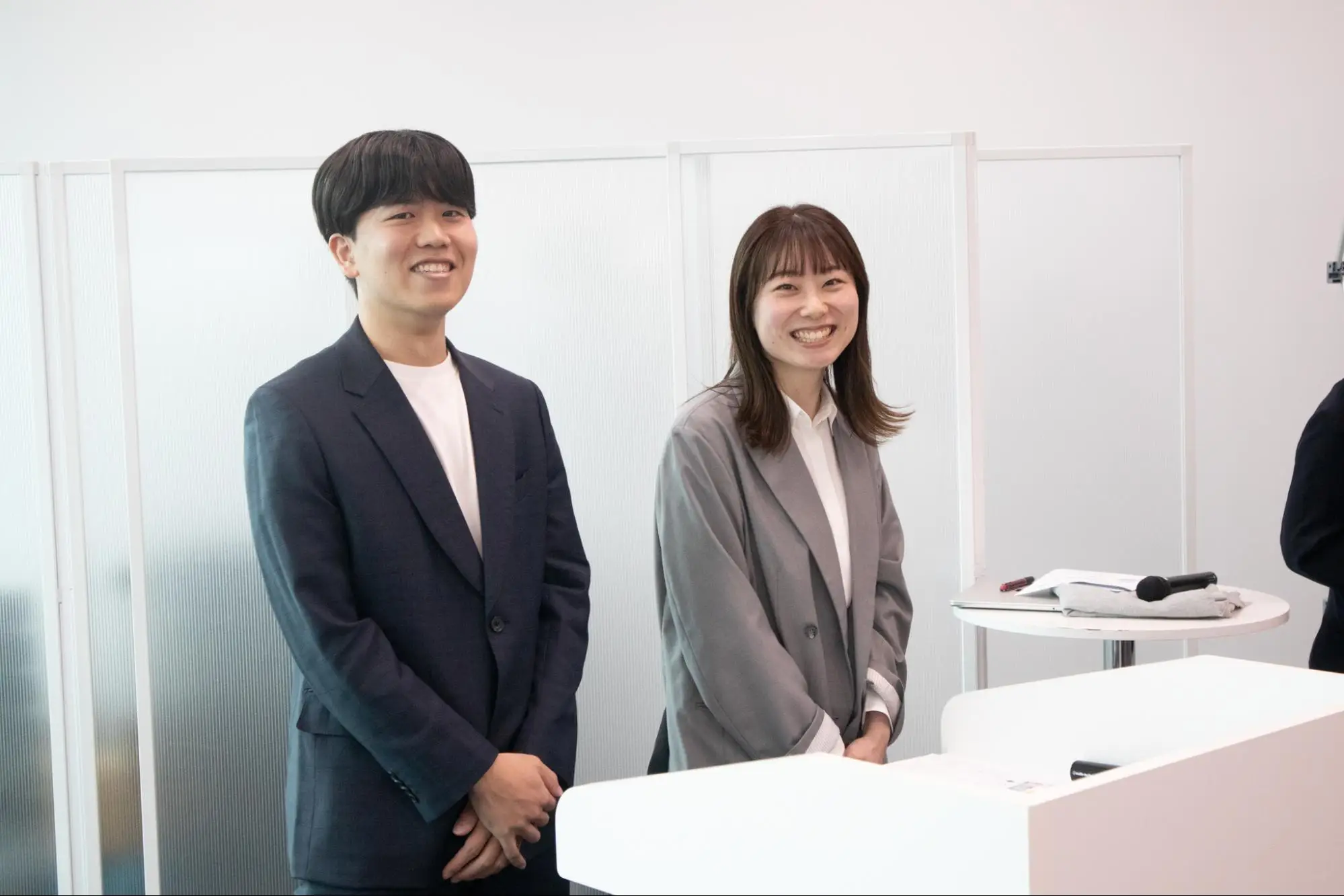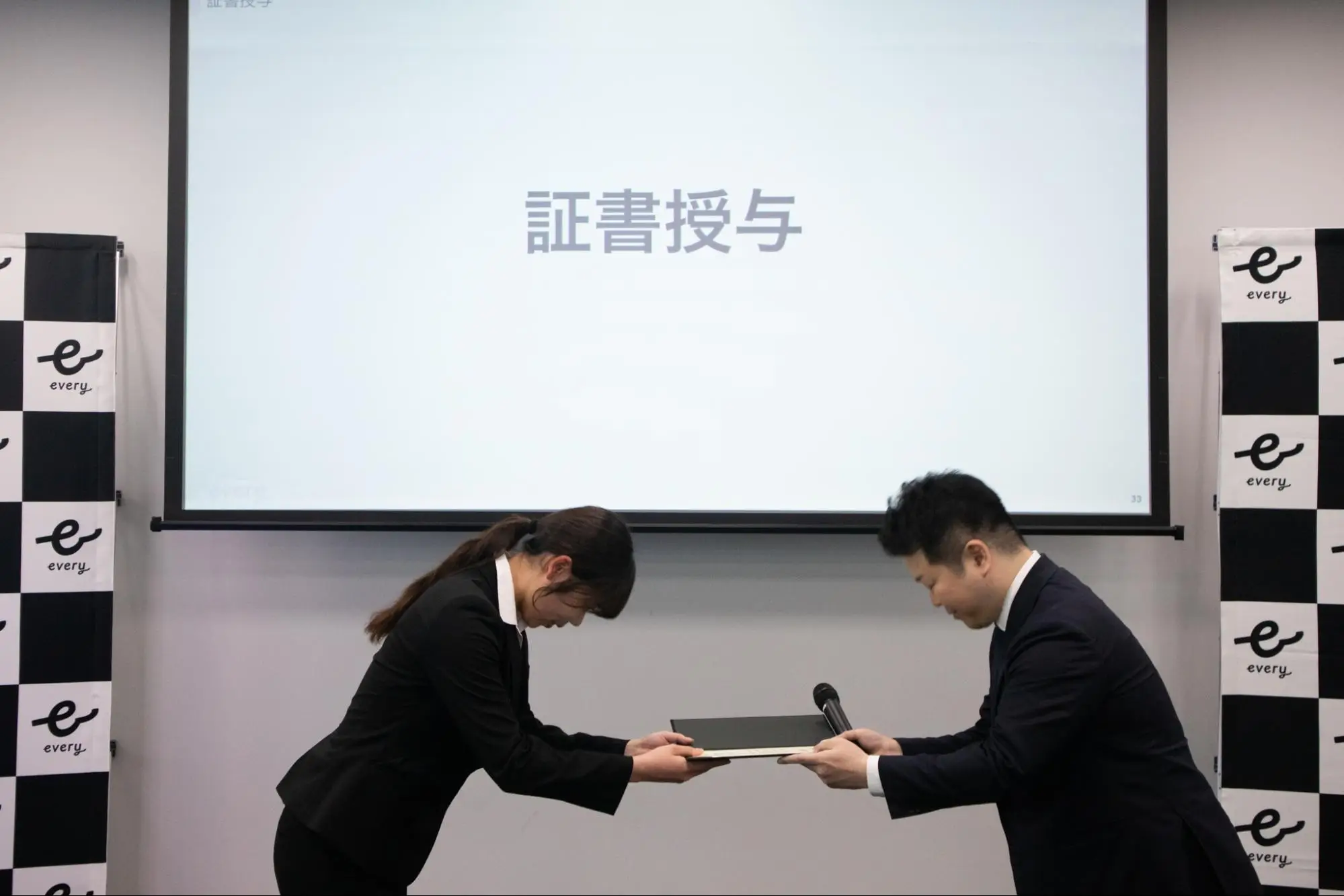 入社式の最後には、先輩社員から26卒オンボーディングプロジェクトについて発表されました。このプロジェクトは24卒・25卒の新卒社員が主体となり、新入社員の入社後の早期立ち上がりと、エブリー社員との早期関係構築を目的としたサポート制度です。「素直な姿勢でオーナーシップを身につけ、事業貢献できる状態」を目指す新卒像として掲げ、マインドセットやスキルを早期に身につけていただくためのプログラムになっています。
