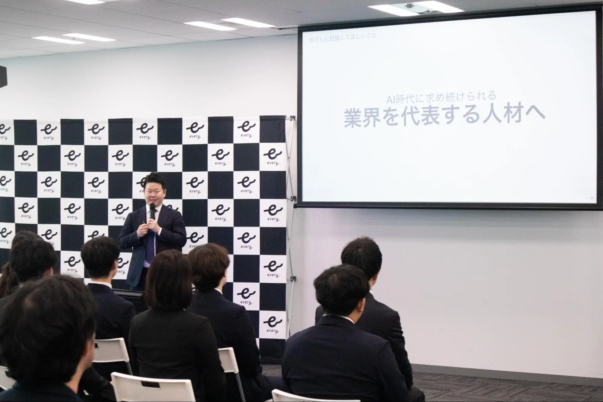 新入社員のみなさんへのメッセージとして「世の中を変えていく側の人間になろう」という力強い言葉が贈られました。"AI元年の新卒"として、変化をし続け、業界を代表する人材になってほしいという期待が寄せられていました。
