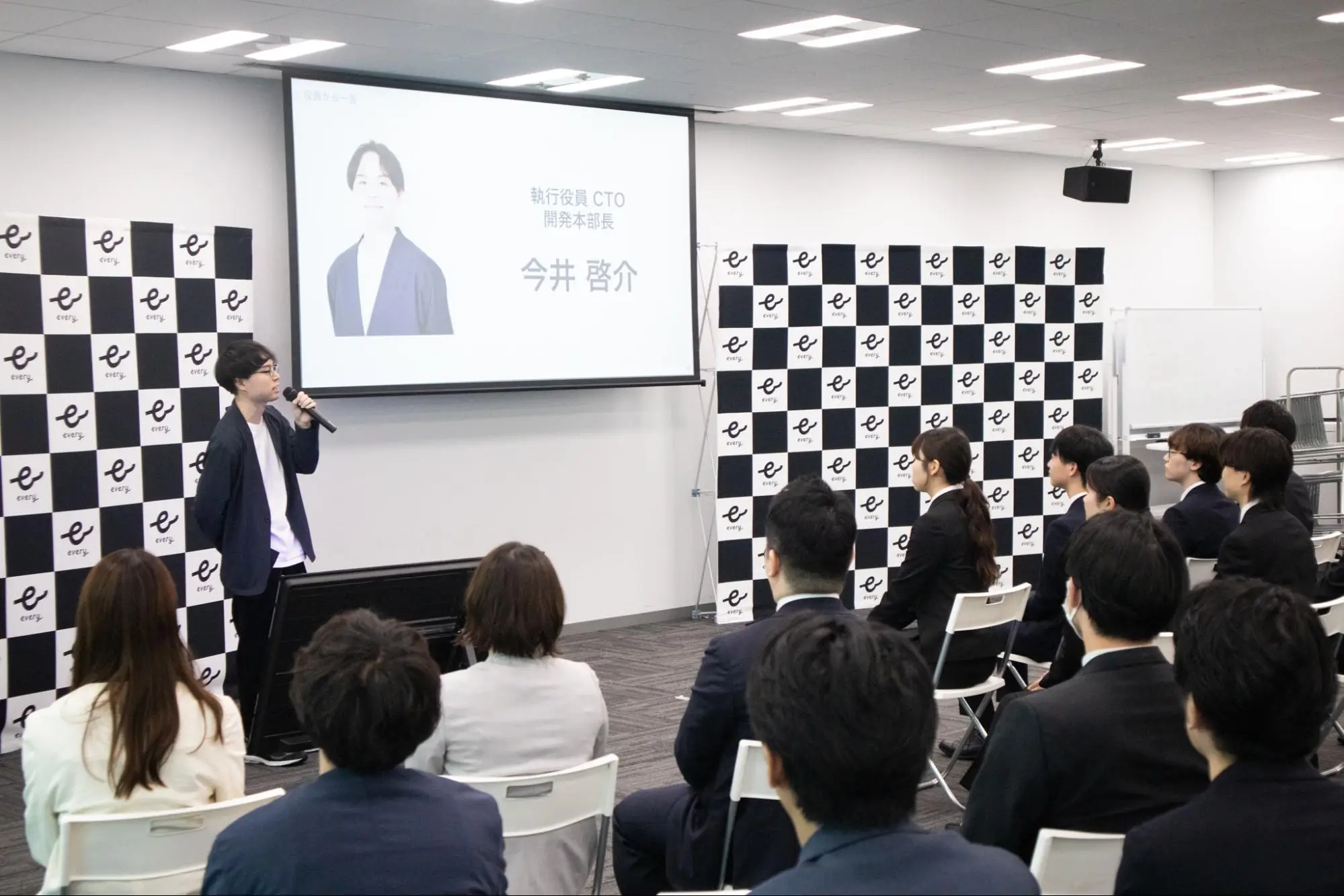 まず始めに、代表の吉田より当社のパーパスやミッション、大切にしている価値観などのお話がありました。「明るい変化の積み重なる暮らしを誰にでも」というパーパスと「前向きなきっかけを一人一人の日常に届ける」というミッションのもと、AI ファーストカンパニーとして進化を続けるエブリーの今と、これから目指す姿についてのメッセージをお話いただきました。